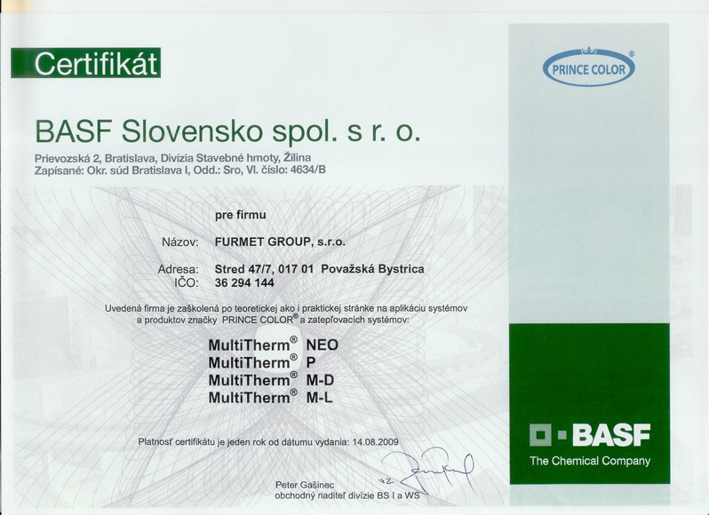Certifikát na aplikáciu systémov a produktov značky PRINCE COLOR a zatepľovacích systémov: MultiTherm NEO, MultiTherm P, Multitherm M-