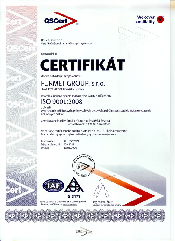 Spoločnosť vlastní certifikát o zavedení a používaní systému manažérstva kvality podľa normy ISO 9001:2008 v oblasti: Vykonávanie inžinierskych, priemyselných, bytových a občianskych stavieb vrátane vybavenia sídliskových celkov.