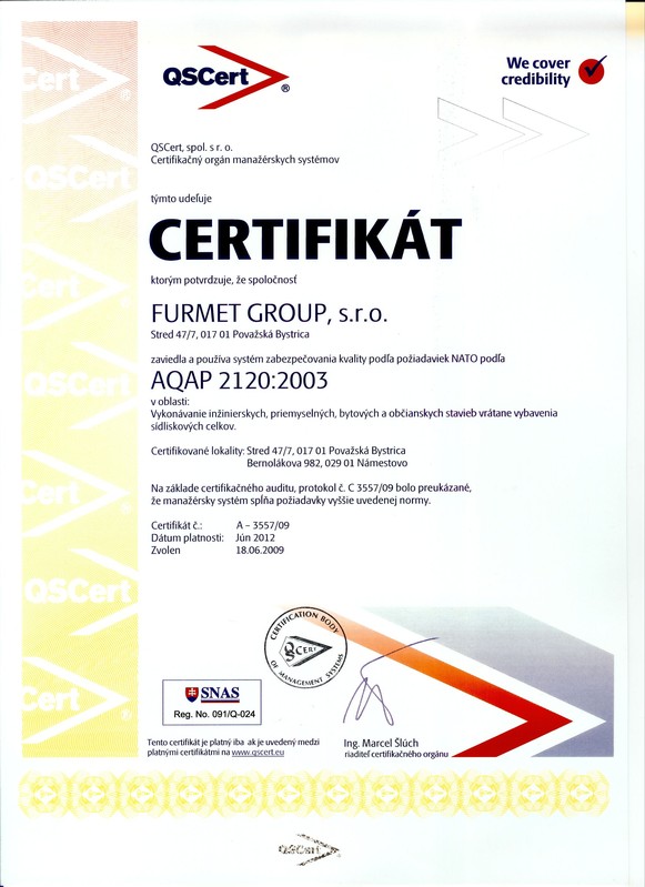 Certifikát o zavedení a používaní systému zabezpečovania kvality podľa požiadaviek NATO podľa AQAP 2120 : 2003 v oblasti : Vykonávanie inžinierskych, priemyselných, bytových ačianskych stavieb vrátane vybavenia sídliskových celkov.